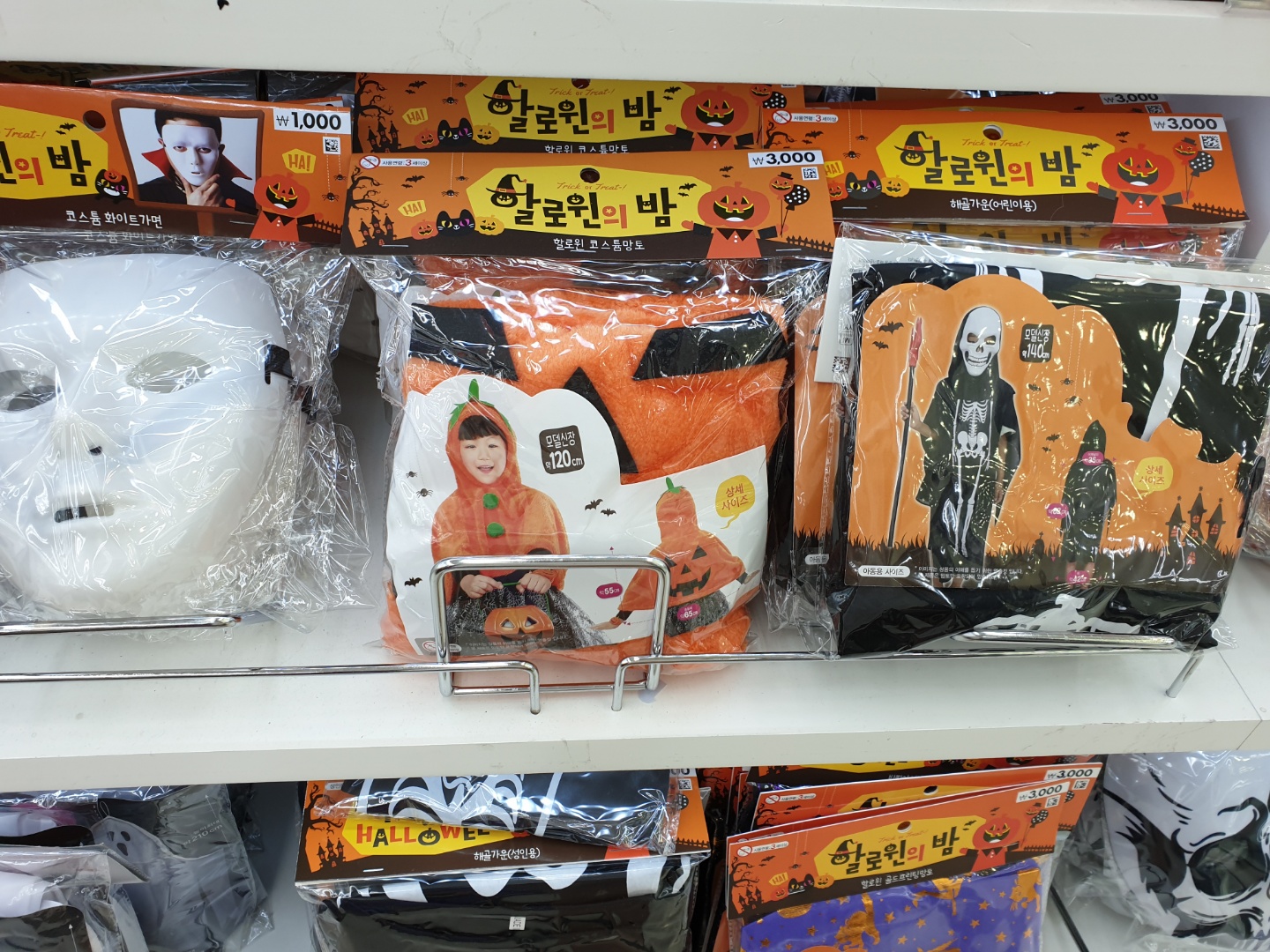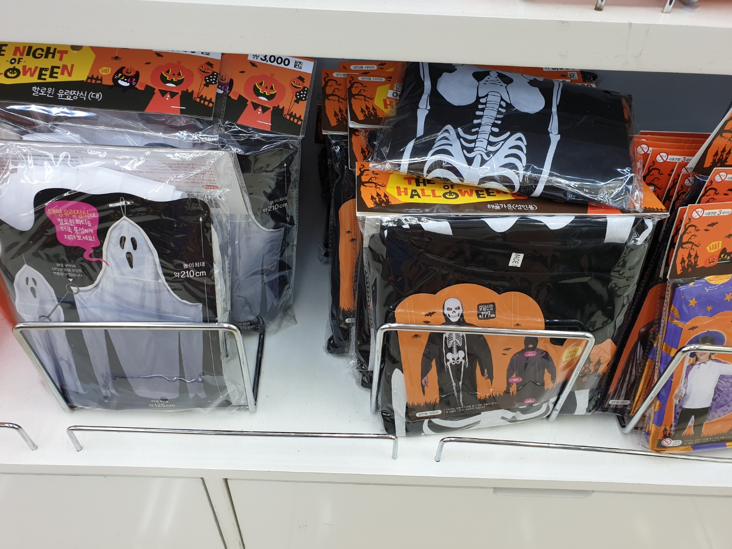 다이소에 할로윈데이 파티를 즐길때 필요한 할로윈 의상 성인용도 있었는데요, 해골 가운 성인용, 망토 등 성인들이 사용할 수 있는 할로윈 의상도 준비되어 있으니 근처 다이소에 갈 일 있으면 1년에 한번밖에 없는 할로윈데이 날짜 10월31일 파티를 위해서 저렴하게 소품, 분장 준비하셔도 좋을 것 같더라구요.