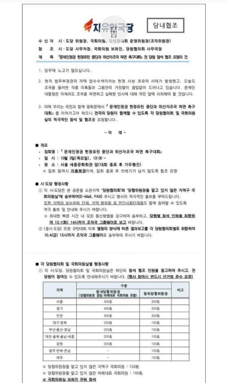이 광화문 집회 참여를 위하여 각 지역위원회 등에 총동원령을 내려졌으며, 황교안 자유한국당 대표 등 광화문 집회 참여를 독려하는 등의 총력을 다하고 있으며, 광화문 집회에 많은 국민들이 참여해주기 바란다고 밝혔으며, 검찰에 대한 불법적인 압박을 즉각 중단할 것을 문재인 대통령에게 엄중히 경고한다며, 문재인 대통령이 계속 외곬의 길을 고집한다면 국민의 심판은 물론 법적까지 책임지게 될것이라고 강조 하였습니다.