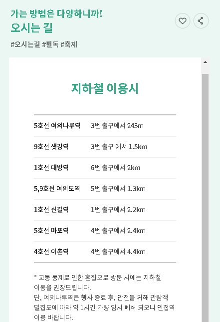 여의동로(마포대교 남단 - 63빌딩) 구간은 행사장 차량 외 전면 통제되며 올림픽대로와 노들길 - 63빌딩 진입구간은 현장 상황에 따라 탄력적 통제가 이루어 진다고 해요.