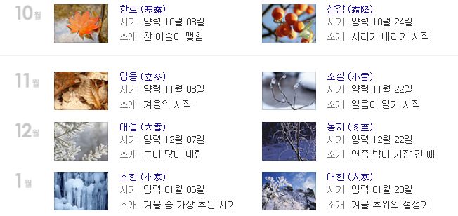 태양의 황도상 위치에 따라 계절적으로 구분을 하기 위하여 만든것인 절기는 황도에서 춘분점을 기점으로 15도 간격으로 점을 찍어 총 24개의 절기로 구분하고 있는데요, 오늘은 24절기 중 17번째 절기인 한로에 대하여 알아보도록 할게요.