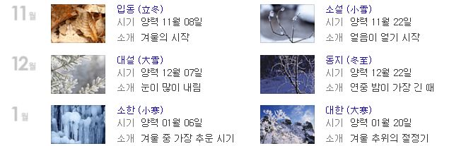 태양의 황경에 맞추어 1년을 15일 간격으로 24등분하여 계절을 구분한 것을 바로 24절기라고 하는데요,