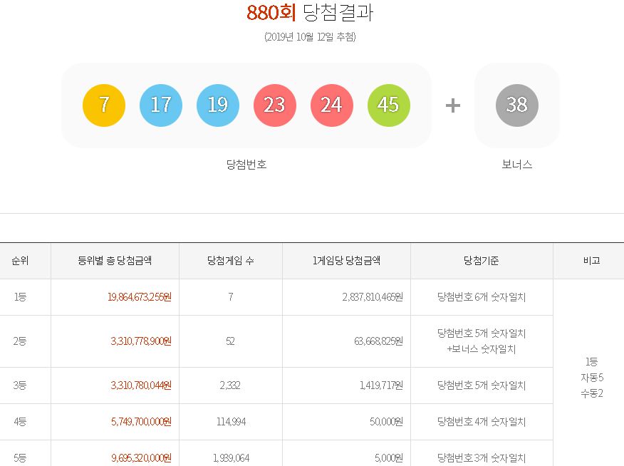 진짜파스타 대표 오인태씨가 추첨한 880회 로또당첨번호 행운의 1등 숫자는 7, 17, 19, 23, 24, 45이며 2등의 보너스번호의 행운숫자는 38로 총 7명의 당첨자가 나왔습니다.