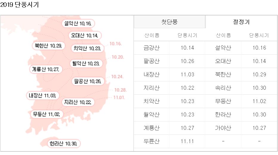설악산 단풍 절정기 : 10월16일이며, 첫 단풍 시기는 9월27일, 팔공산 단풍 절정시기는 10월26일이며 첫단풍 기시는 10월18일 입니다.
