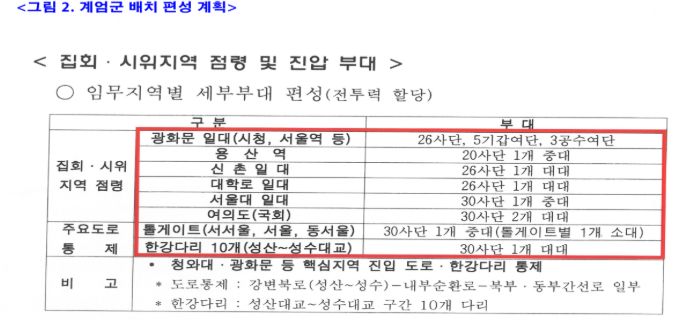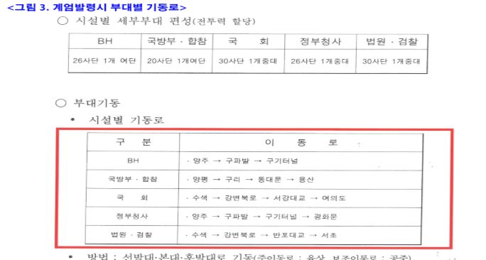 이 계엄령 문건 내용의 요약은 1. 청와대, 국방부, 용산, 신촌 일대, 시청, 여의도, 톨게이트(서울, 서서울, 동서울), 한강다리에 계엄군 배치를 부대별 기동로, 기동방법까지 자세하게 써놓았네요.