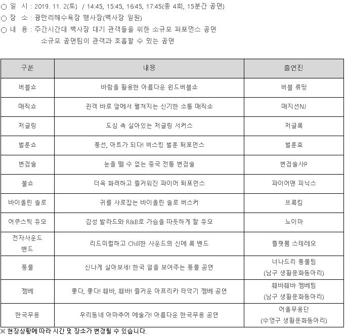 부산 불꽃축제 일정에 맞추어 바닷가 앞에 무료로 명당을 차지하시려면? 일찍 가서 대기하는수 밖에 없는데요, 2019년 부산 불꽃축제 일정은 불꽃쇼는 6시부터지만 2시45분부터 불꽃버스킹 등 다양한 공연이 준비되어 백사장에서 대기하는 관람객들을 위하여 소규모 퍼포먼스 공연등이 다양하게 진행된다고 하니, 지루하지 않게 기다릴 수 있을 것 같아요.
