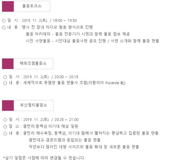 부산 불꽃축제 일정은 2019년 11월2일 토요일에 진행되며 시간은 6시부터 7시55분까지는 불꽃토크쇼, 8시 - 8시 15분까지는 해외 초청 불꽃쇼, 8시25분 - 9시까지는 광안대교 경관 조명과 융합되는 불꽃을 35분갖 연출하고, 작년보다 더 많아진 대형 사이즈의 불꽃 확대 및 새로운 불꽃이 많이 연출된다고 하더라구요.