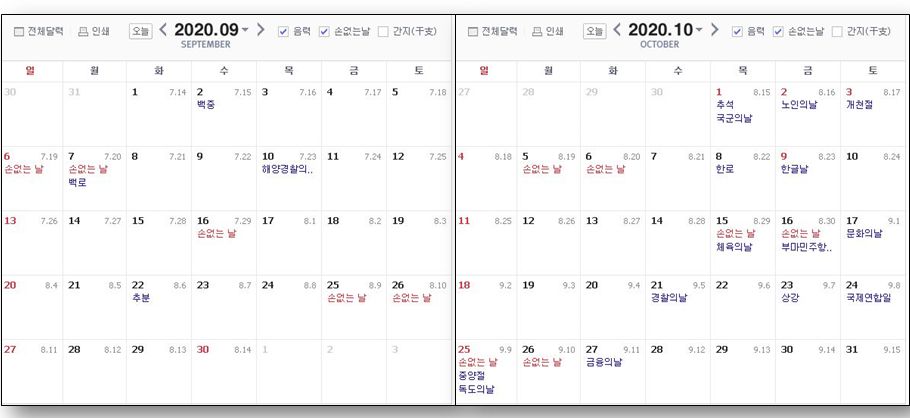 2020년 9월 공휴일은 30일 추석 공휴일 하루 있구요, 2020년 9월 달력에 손없는날은 6일, 7일, 16일, 25일, 26일 입니다.