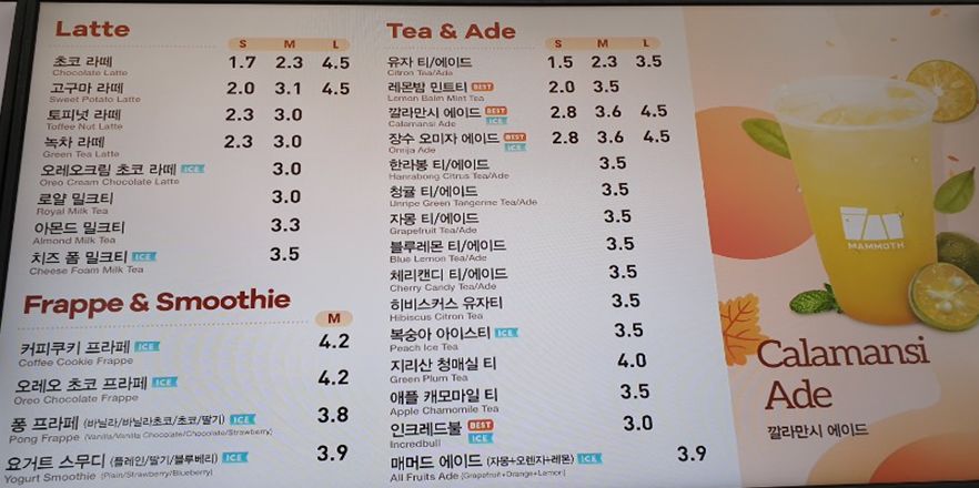 제가 갔던 매머드 커피는 키오스크에서 무조건 결제 후 음료를 받게 되어있더라구요. 그래서인지 젊은사람들은 쉽게 주문할 수 있지만, 나이드신분들에게는 매머드 커피 이용하시는게 좀 어려울 수도 있을 것 같았는데요, 매머드 커피 메뉴, 가격은 아래와 같아요.