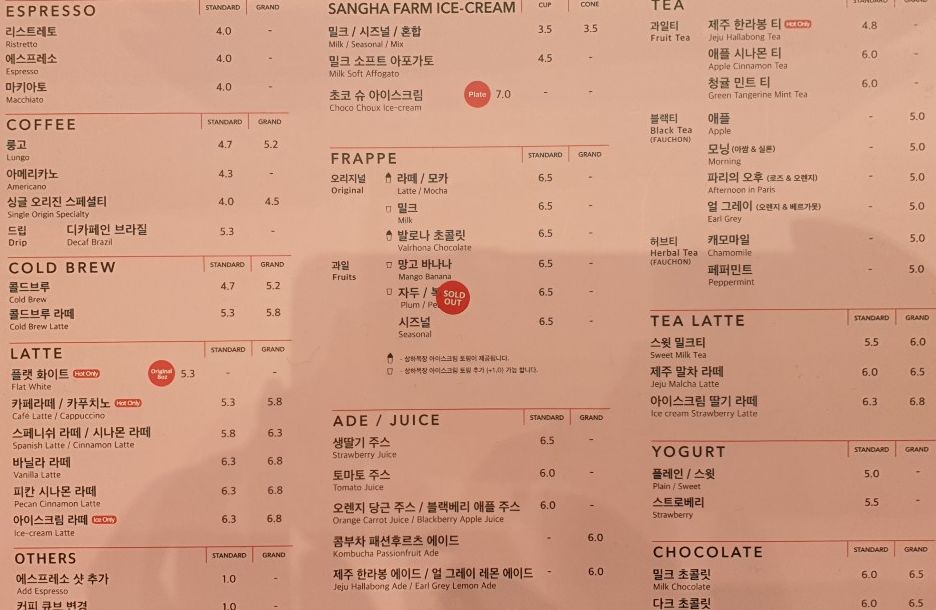 폴바셋 커피 메뉴판 입니다. 폴바셋 아메리카노 스탠다드 사이즈는 4,300원이구요, 폴바셋 커피 메뉴는 스탠다드, 그랜드 2가지 사이즈로 되어 있나 봅니다.
