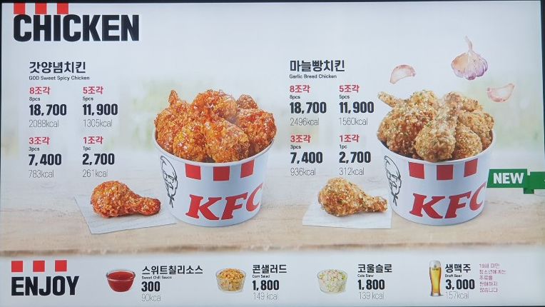 저도 오랜만에 kfc 매장을 방문했는데, 갓양념치킨, 마늘빵치킨 메뉴가 새로 나왔더라구요.