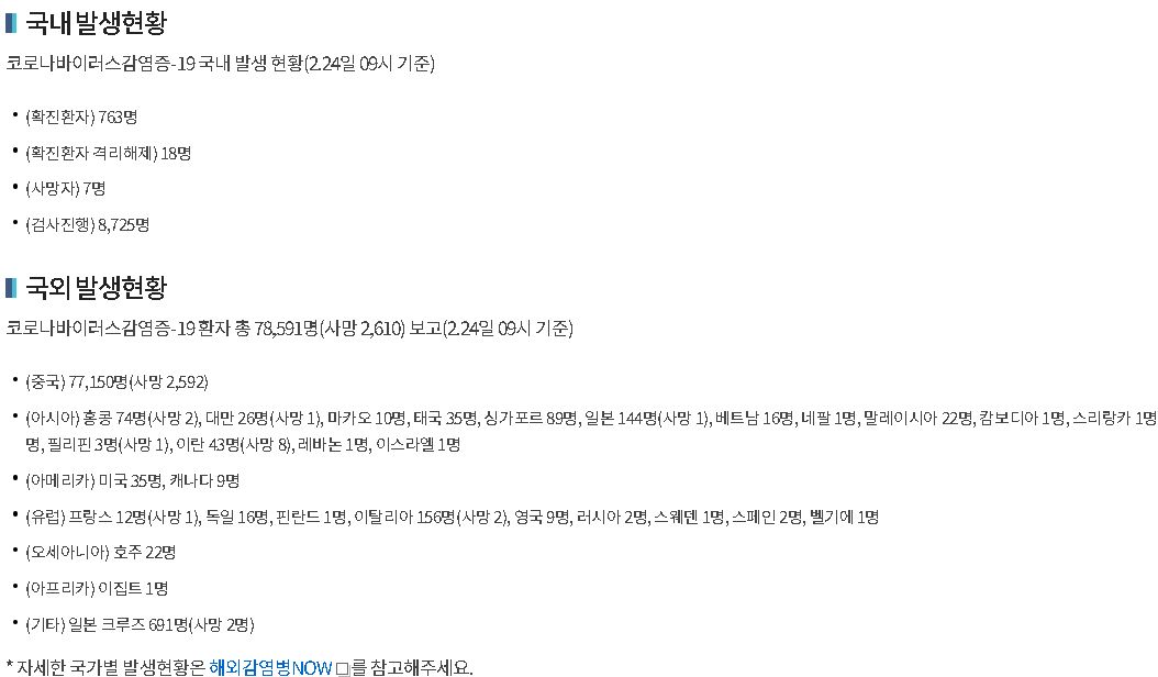 국내 코로나 바이러스 감염증(코로나19, 우한폐렴)의 발생 현황은 금일 2월24일(월)9시 기준 코로나 확진자 763명, 확진 환자 격리해제 18명, 코로나 사망자 7명, 검사 진행 환자 8,725명입니다.