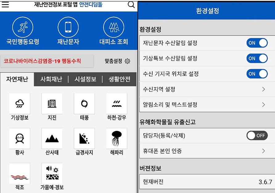 각 지역별 해당 지자체에서 지진이나 태풍, 폭설 등을 안전디딤돌 어플에서 확인이 가능합니다. 현재는 코로나19 알림 관련 정보 문자들에 대한 정보를 받아볼 수 있는데요,