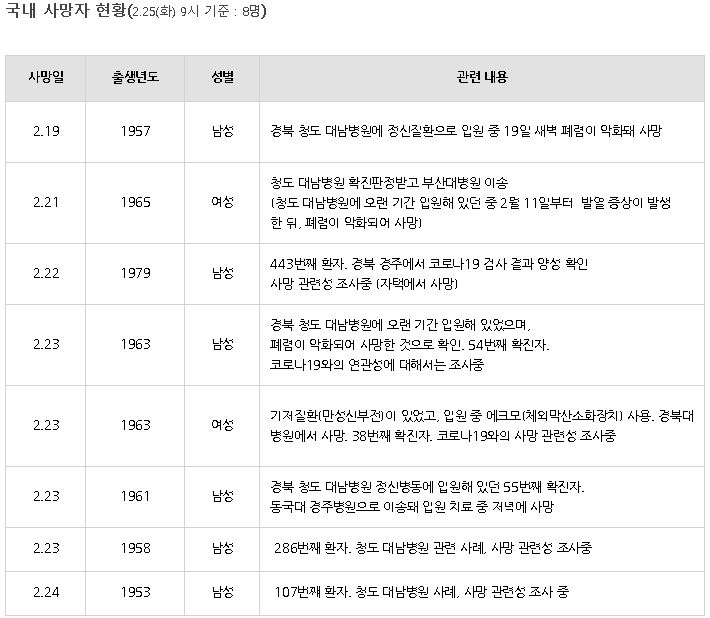 국내 코로나 바이러스(코로나19, 우한폐렴) 확진자가 급격히 늘고있는 가운데, 금일 2월25일(화) 오전 코로나 9번째 사망자가 발생하였습니다.