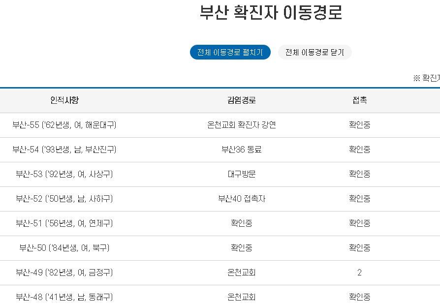부산 54번 코로나 확진자는 93년생 남성으로 동래구에 거주하는것으로 확인 되었으며, 36번 온천교회의 동료입니다. 부산 55번 코로나 확진자는 62년생 수영구에 거주하는 여성으로 온천교회에서 강연을 했다고 합니다.