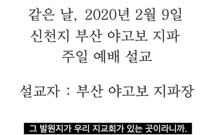 유튜브 종말론사무소에 신천지 지도부의 구속수사를 요청합니다. 에서 2020년2월9일 부산 신천지 야고보 지파 주일 설교 전체 내용이 확인 가능합니다.