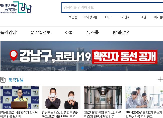 강남구 홈페이지에는 강남구 코로나 확진자 동선을 매우 빠르게 공개하고 있습니다.