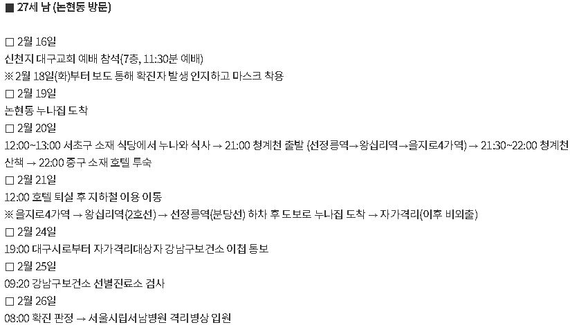 20일 이후부터 질병관리본부 홈페이지에서 코로나 확진자 동선을 공개하였지만 갑자기 대거 확산으로 인하여 각 시, 구 별로 코로나 확진자 동선을 공개하고 있습니다. 여기에서도 어떤 구는 코로나 확진자 동선 공개가 매우 빠르기도 하며, 어떤곳은 느린곳도 있습니다.