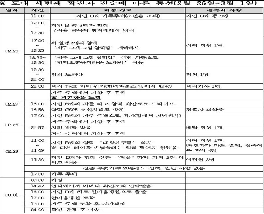 3번째 제주시 코로나 확진자는 여성으로 현재 제주대학교병원에서 격리 치료중이며, 현재까지 조사된 역학조사에 의한 동선은 위에서 확인 가능합니다.