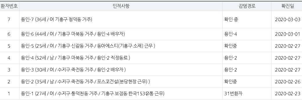 추가로 용인시 처인구 김량장동 다보스병원에서 코로나 의심환자가 발생하여 검사결과를 기다리는 중이며, 현재 용인 코로나 확진자는 총 7명입니다.
