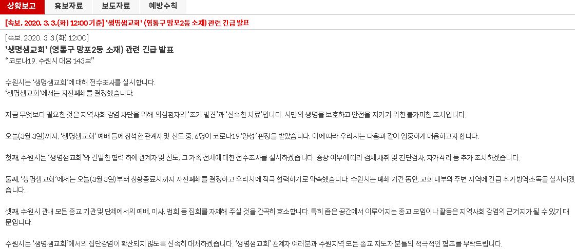 수원 영통구 망포동 생명샘교회는 금일 3월3일(화)부터 상황종료시까지 자진 폐쇄를 결정하였으며, 수원시에서는 폐쇄 기간동안 교회 내부 및 주변지역에 추가 방역 소독을 실시중이며, 생명샘교회에서의 집단 감염이 확산되지 않도록 신속치 대처중입니다.