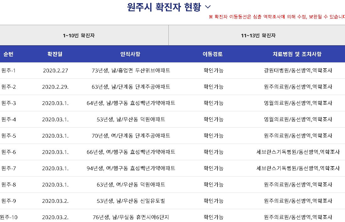 11번, 12번, 13번째 원주 코로나 확진자 동선은 역학조사가 끝나는대로 원주시 홈페이지에 공개될 예정입니다.