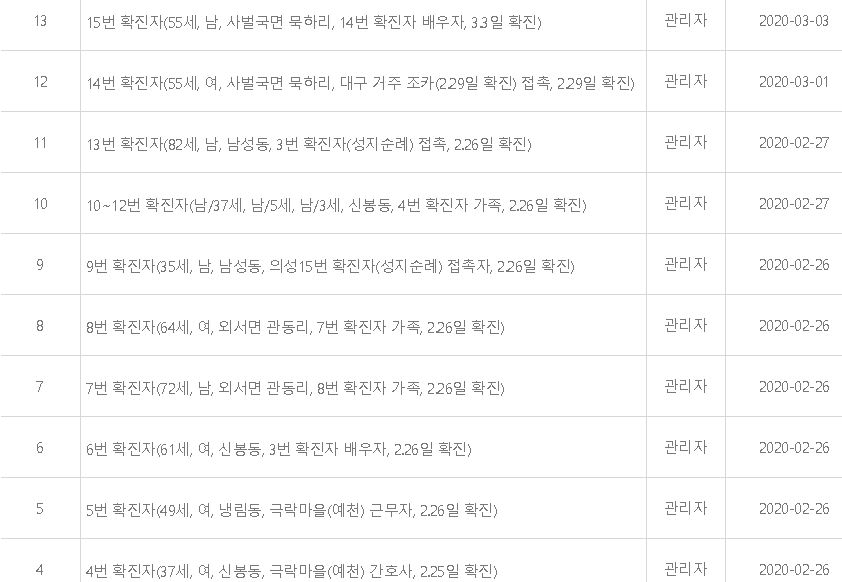 현재까지 상주 코로나 확진자는 총 15명이며, 15번째 상주 코로나 확진자는 55세 남성으로 사벌국면 묵하리에 거주하는것으로 알려졌으며, 14번째 코로나 확진자의 배우자로 알려졌습니다.