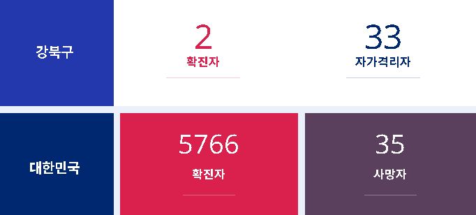현재 강북구 코로나 확진자는 2명이며 구체적인 감염경로, 동선은 역학조사 후 강북구청 홈페이지 사이트에 공개 될 예정입니다.