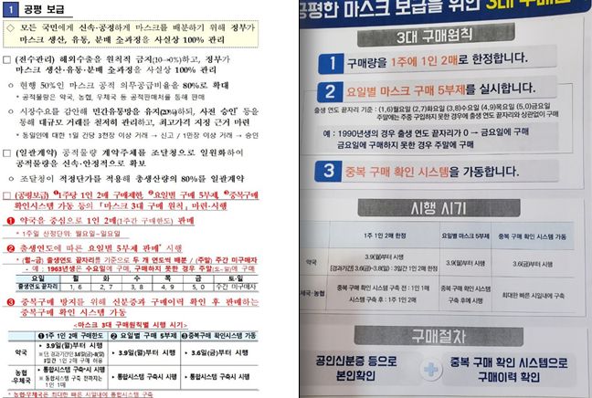 구매량은 1주에 1인 2매로, 요일별 마스크구매 5부제가 실시되며, 약국에서는 중복구매 확인 시스템이 구축되어 6일부터 신분증을 제시하여야 마스크 구매가 가능합니다.