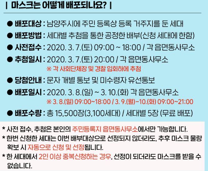 남양주 마스크 무료 배포 수량은 총 15,500장으로 세대별 5장씩 무료 배포할 예정이며, 남양주 내 각 읍면동사무소에서 금일 18시까지 사전 접수 후 추첨을 통하여 문자 개별 통보 및 미수령자 유선통보를 한다고 합니다.