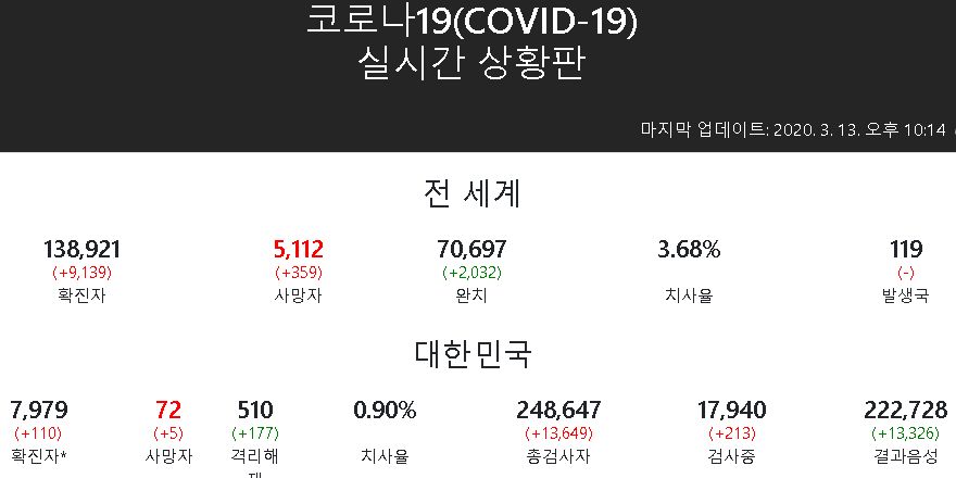 금일 3월13일 22시14분 기준 국내 코로나19 현황 입니다.