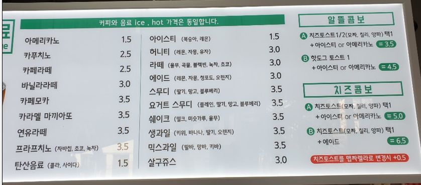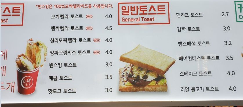 빈스킹 토스트 메뉴 가격