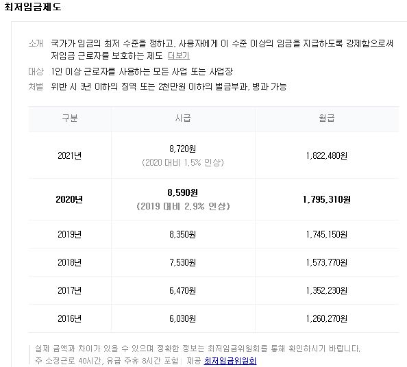 2021년 최저임금은 2020 대비 1.5% 인상되어 8,720원으로 인상된다고 합니다.