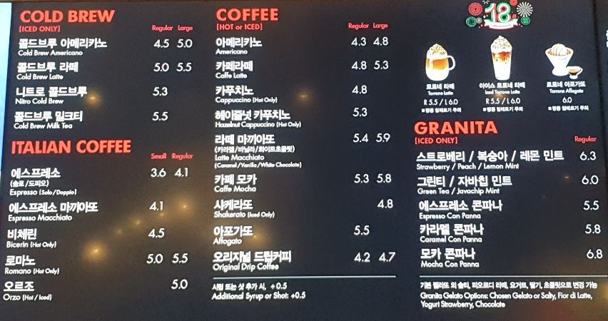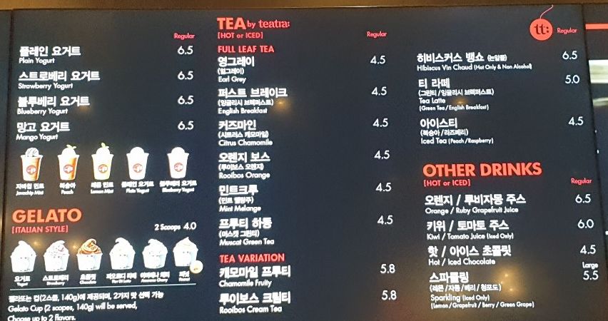 파스쿠찌 메뉴판 입니다. 기본적으로 파스쿠찌 메뉴판에는 커피 메뉴, 티, 요거트, 젤라또 등이 있습니다.