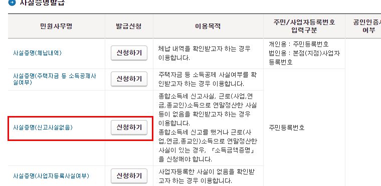 직장을 다니지 않거나, 사업을 하고 있지 않아서 소득이 없는 경우에는 소득 신고 내역도 없으므로 사실증명 (신고사실없음) 메뉴를 선택하여 신청하기 버튼을 누르면 됩니다.