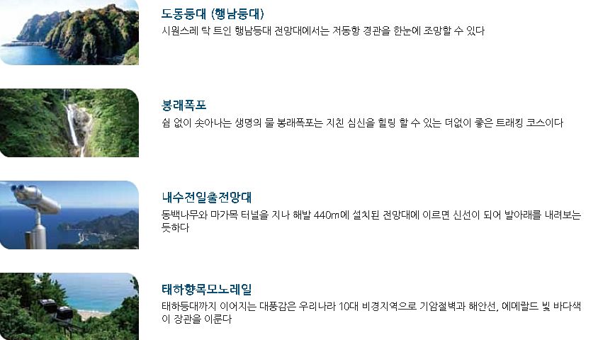 내수전 일출 전망대 - 독도 관광 - 나리분지, 성불사, 예림원, 북면지역 관광 - 성인봉 관광 - 약수공원 - 봉래폭포 - 죽도관광 - 도동시가지 관광 이렇게 입니다.
