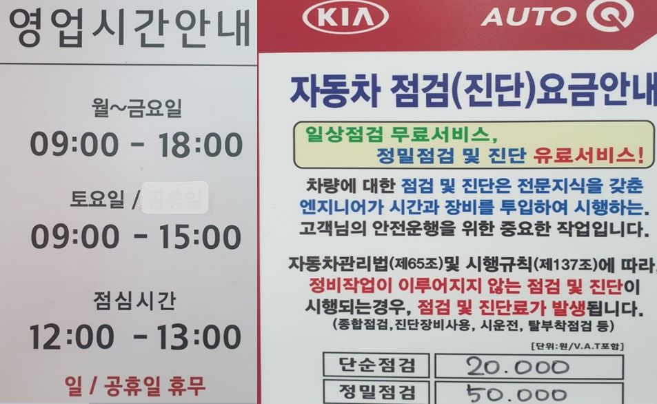 제가 방문했던 기아자동차 서비스센터 기아 오토큐(AUTO Q)는 직영점은 아니었고, 일상점검은 무료서비스, 정밀 점검 및 진단은 유료로 진행중이었습니다.