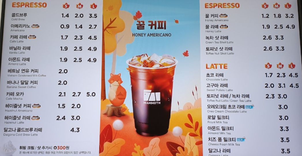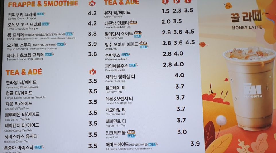 매머드 커피 메뉴 대부분이 가격이 저렴했고, 샷 추가에 따라 금액이 조금씩 달라지는 것 같았어요.