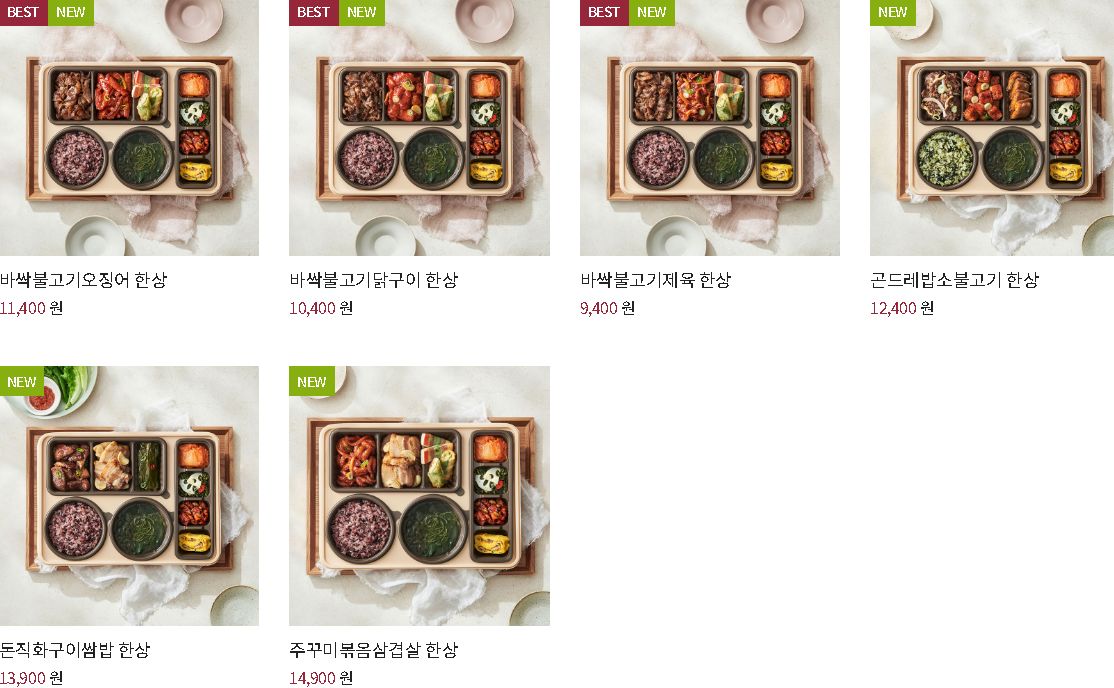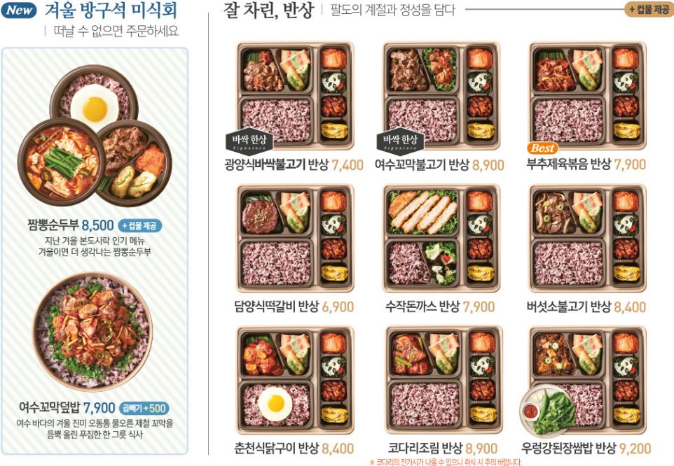 본도시락 메뉴는 잘 차린 한상, 반상, 한정식, 소반상, 일품반찬으로 구성되어 있으며, 최근 신메뉴로 겨울 방구석 미식회 메뉴가 새롭게 출시 되었습니다.