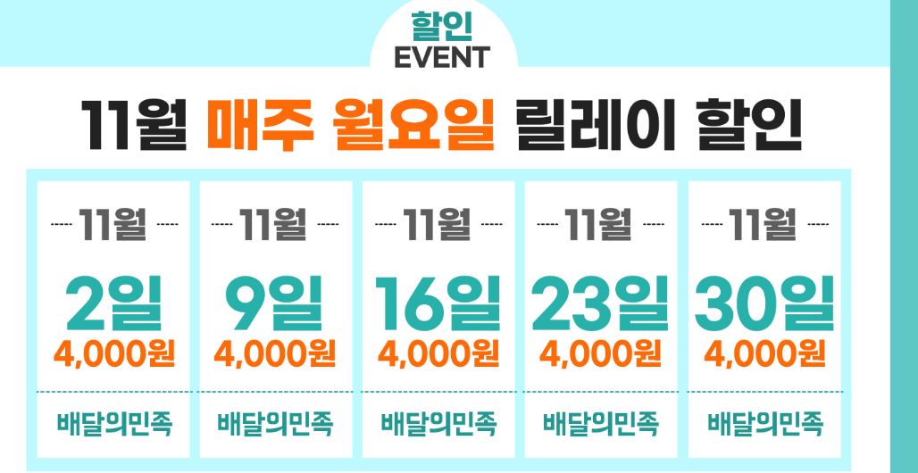 네네치킨 11월 이벤트 소식입니다. 배달의 민족에서 11월 매주 월요일 4천원 할인이 진행된다고 하니, 네네치킨 메뉴 가격 고민이시라면 매주 월요일 배달의 민족 어플(앱)에서 주문하시고 꼭 월요일에 먹고싶길 바랍니다.