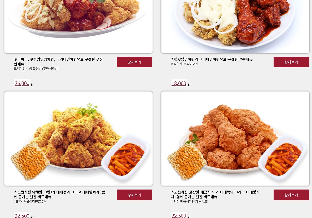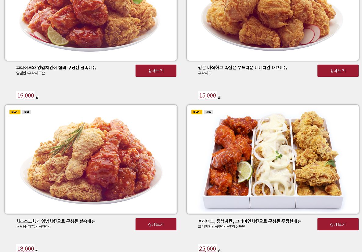 네네치킨 청양마요 치킨, 소이크런치 콤보, 소이크런치 윙봉, 치킨이 떡볶이라면(치즈), 치킨이 떡볶이라면(그린), 치킨이 떡볶이라면(매콤치즈), 매콤치즈 스노윙, 양념치킨, 스노윙치킨, 크리미언 치킨, 핫블링치킨, 후라이드, 오리엔탈 파닭, 양념반+후라이드반, 크리미언반 + 핫블링반, 스노윙치즈반 + 양념반, 3가지 종류의 네네치킨 메뉴를 맛볼 수 있는 크리미언반 + 양념반 + 후라이드반 메뉴 가격은 25,000원 입니다.