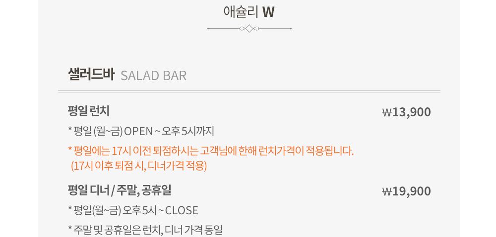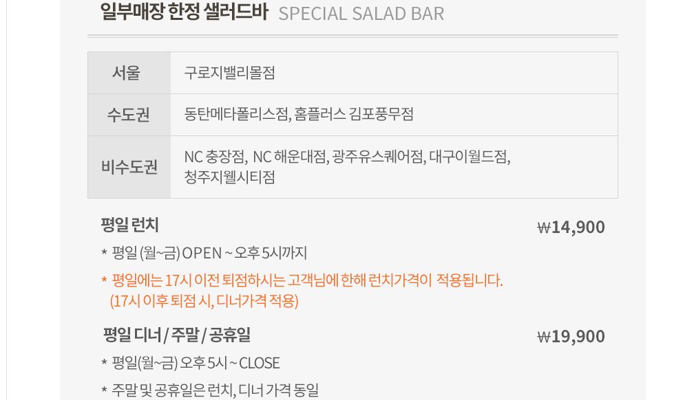 애슐리 w 일부매장 한정 샐러드바 가격이 상이합니다. 서울 구로지밸리몰점, 동탄 메타폴리스점, 홈플러스 김포풍무점, NC 충장점, NC 해운대점, 광주 유스퀘어점, 대구 이월드점, 청주 지웰시티점의 애슐리 w 가격은 평일런치가 다른매장보다 1천원 비싼 14,900원 입니다.