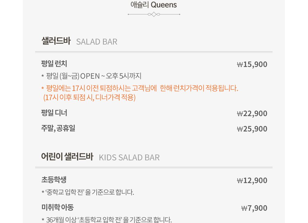 애슐리 가격 퀸즈 입니다. 평일 런치 애슐리 퀸즈 가격은 15,900원이며, 평일 디너는 22,900원, 주말이나 공휴일에 애슐리 퀸즈 가격은 25,900원 입니다. 애슐리 퀸즈 가격 중학생 고등학생도 성인 가격 입니다.