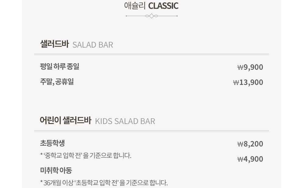 애슐리 클래식 가격은 샐러드바 평일 하루종일 가격으로 9,900원이며, 주말이나 공휴일 가격은 13,900원 입니다. 애슐리 클래식 어린이 샐러드바 이용 가격은 초등학생은 8,200원, 미취학아동은 4,900원이며, 초등학생 기준은 중학교 입학전을 기준으로 하며, 미취학아동은 36개월 이상 초등학교 입학전을 기준으로 합니다.