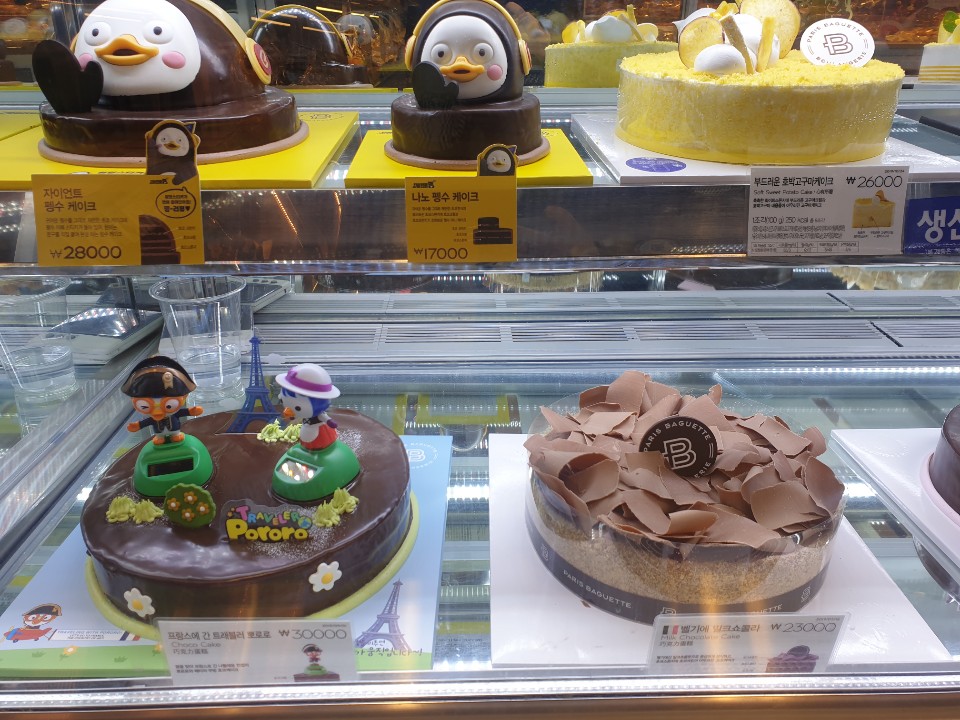 얼마전 들렀던 파리바게뜨 케익 가격입니다. 아이들이 좋아할만한 뽀로로 케익 가격은 30,000원이고요, 자이언트 펭수 케이크는 28,000원, 나노 펭수 케이크는 17,000원 입니다.