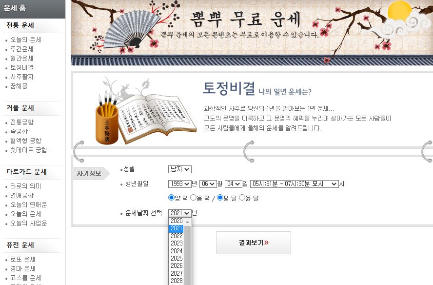 위 사진과 같이 2021년 무료 토정비결을 확인하시려면 사람의 태어난 년도, 날짜, 시간에 따라 토정비결이 다르므로 생년월일과 일시를 함께 넣은 뒤 운세를 원하는 년도 2021 또는 2022년, 2020년을 선택하신 뒤 결과보기까지 누르시면 회원가입이나 로그인 없이 2021년 무료 토정비결을 확인할 수 있습니다.