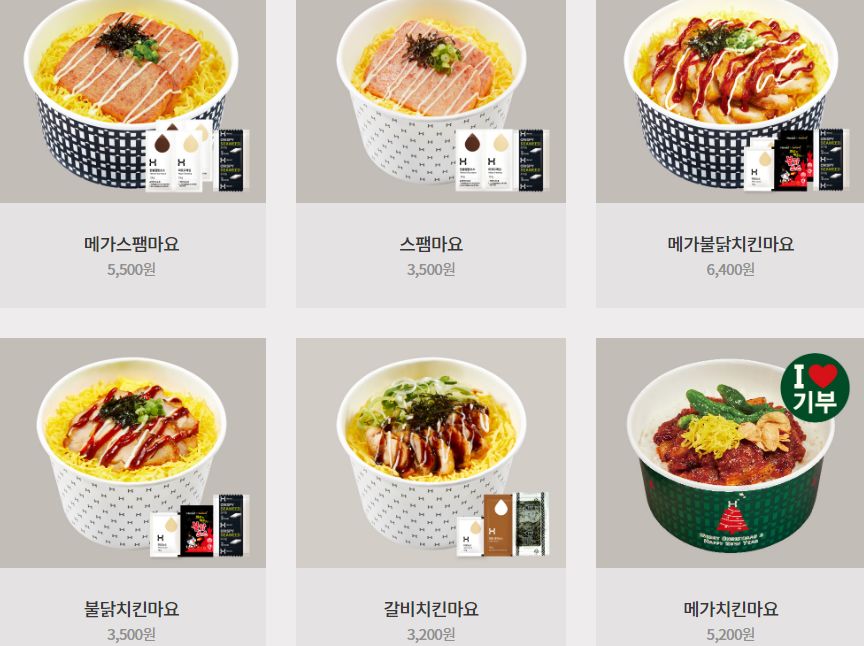 착한메뉴 3종은 고추장 숯불 삼겹 덮밥 6,500원, 숯불직화구이덮밥 5,700원, 메가치킨마요 5,200원 3가지 종류가 있습니다.