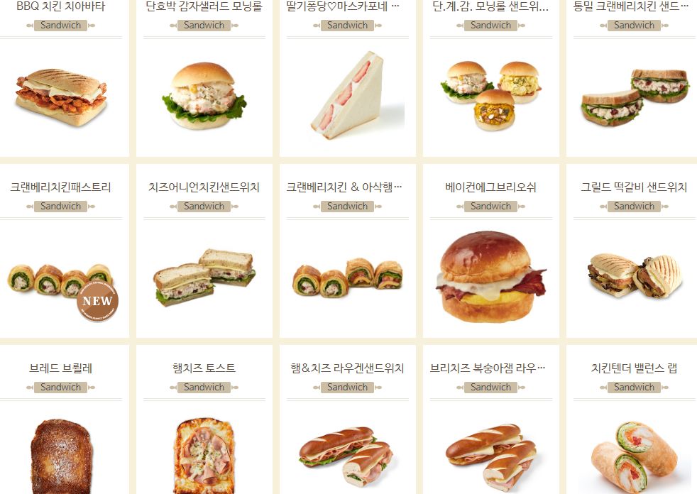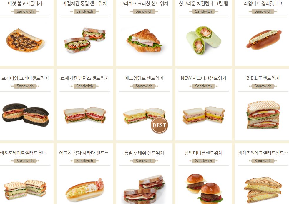 요 아래는 뚜레쥬르 홈페이지에 나와있는 샌드위치 종류입니다. 제가 봤을땐 샌드위치가 아닌 것 같은데 샌드위치 카테고리에 들어 있는것도 있네요. 뚜레쥬르 샌드위치 종류가 이렇게나 많은줄 몰랐는데, 정말로 다양하게 있네요. 이건 샌드위치 칸에 없을수도 있으니 매장을 꼼꼼히 찾아봐야 될 듯! 그리고 전체 메뉴가 없을수도 있으니 그점은 참고하셔서 확인하는것이 좋을 것 같습니다.