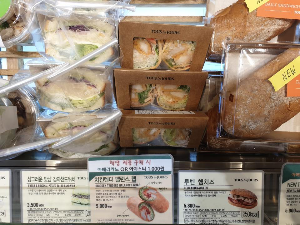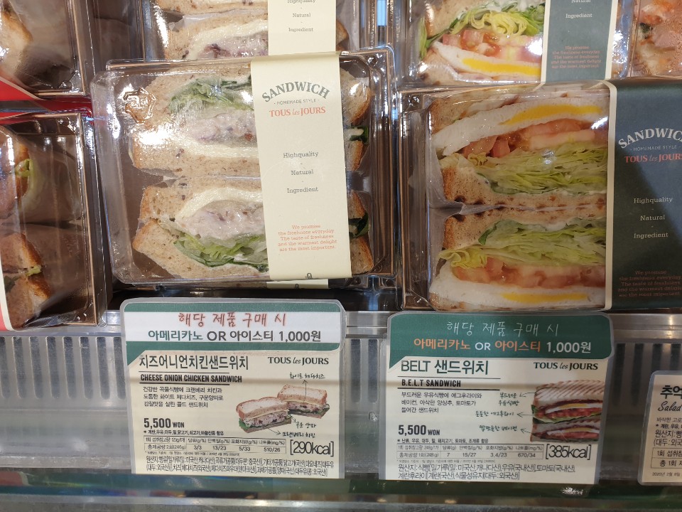 간단하게 한끼 먹기 좋아서 가끔 찾게되는 뚜레쥬르 샌드위치 가격도 그리 나쁘진 않은데 제가 가는 매장에는 샌드위치 구매 시 아메리카노나 아이스티 가격을 1천원에 함께 판매하기 때문에 더 최근들어 뚜레쥬르 샌드위치를 자주 먹었던 것 같아요.