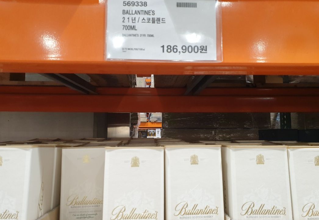 제가 사진을 찍어온 곳은 코스트코이며, 얼마전 이마트 발렌타인 21년산 가격은 코스트코와 약 2만원 정도 차이가 났던 것 같아요. 코스트코 발렌타인 21년산 가격은 186,900원이며, 이마트는 208,000원으로 둘다 동일한 700ml 사이즈였답니다.