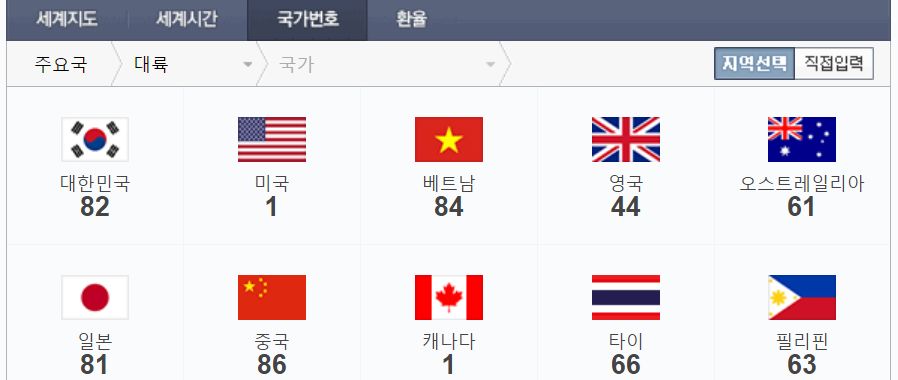 대한민국 +82, 미국 +1, 일본 +81, 중국 +86, 영국 +44, 프랑스 +33, 독일 + 49, 베트남 +84, 오스트레일리아 +61, 필리핀 +63 입니다.
